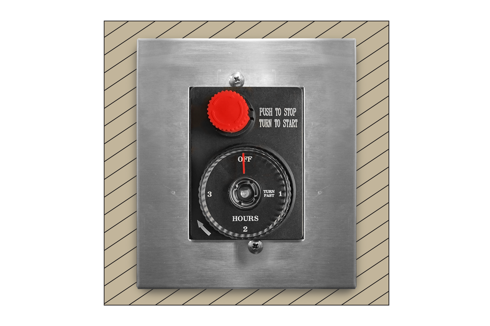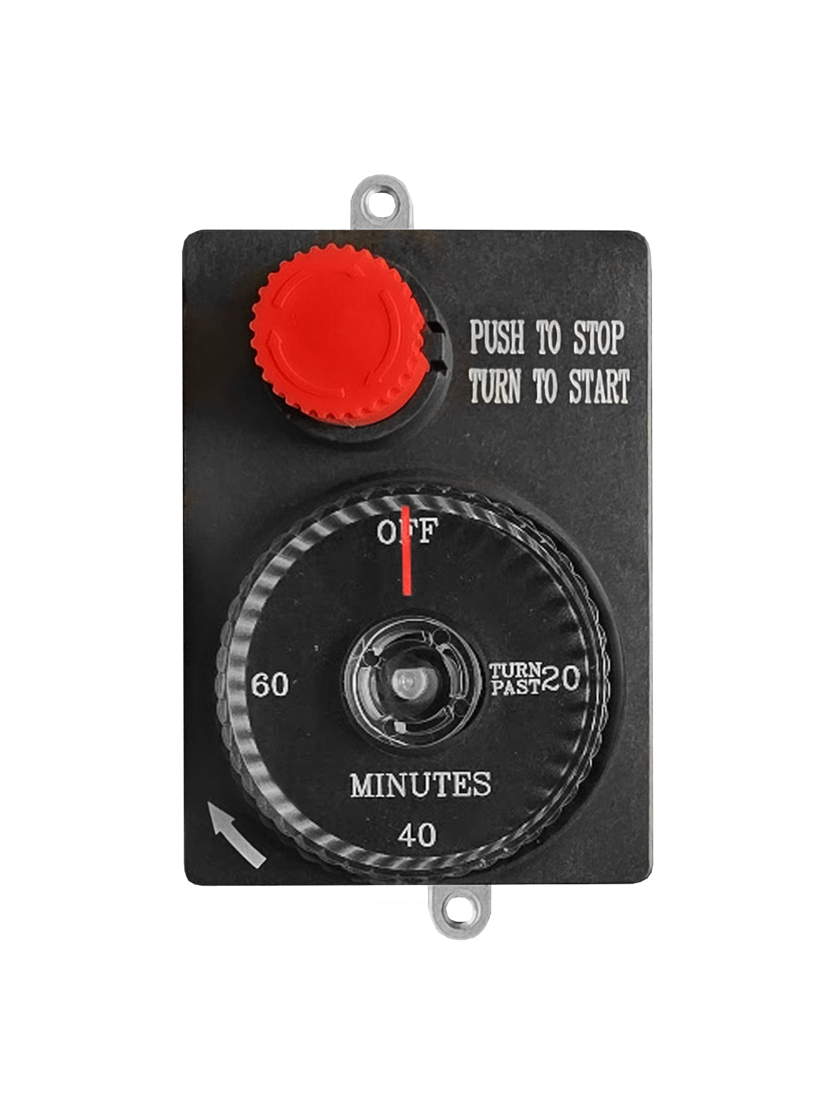 Mechanical timer with manual emergency shut off. 1 hour countdown timer